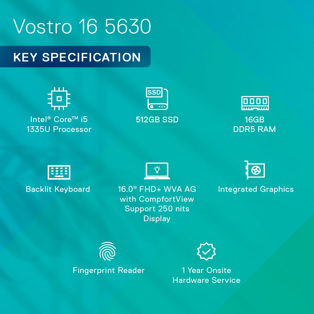 Dell Vostro 5630 (2024) – 13th Gen Intel Core i5-1335U | 16” FHD+ Display | 16GB LPDDR5 | 512GB SSD | Windows 11 | MS Office 2021 | Backlit Keyboard | Fingerprint Reader | Wi-Fi 6E | Titan Grey
