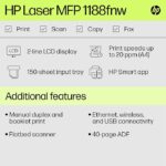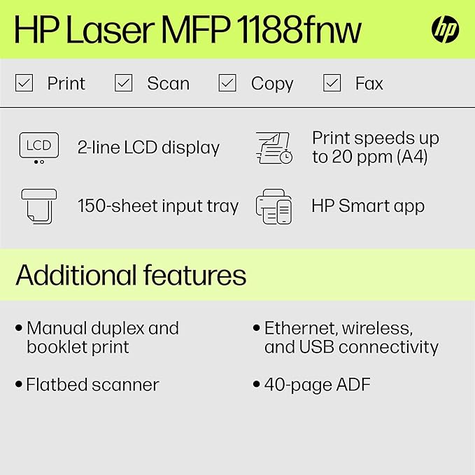A compact and powerful wireless monochrome laser printer for small offices and home use. The HP Laser MFP 138fnw offers printing, copying, scanning, and faxing in one device with fast 21 ppm print speed, 40-sheet ADF, wireless connectivity, and Ethernet support. Efficient and reliable, it’s designed to streamline your productivity.